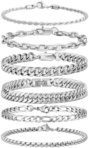 XIANNVXI 6 Pcs Silver Bracelets for Men Women Stainless Steel Bracelet Cuban Chain Metal Link Rope Bracelet Set 7.5 Inches Men Fashion Accessories Jewelry Set: Clothing, Shoes & Jewelry