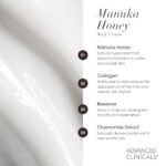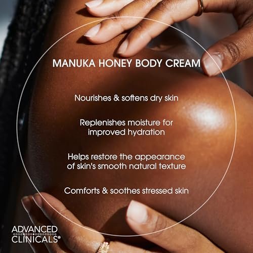 About this item MANUKA HONEY BODY CREAM NOURISHES & SOFTENS DRY, ROUGH SKIN – This Manuka Honey + Collagen body cream provides hydration to soothe and replenish dry, textured skin. It promotes a softer, more comfortable complexion, leaving skin visibly renewed and nourished. Suitable body cream for women and men. MANUKA HONEY LOTION WITH COLLAGEN, VITAMIN E, & BEESWAX – Hydrates and nourishes skin while helping to seal in moisture for softness. Helps visibly renew softness and delivers rich hydration, leaving skin smooth, comforted, and replenished. This blend enhances skin’s resilience, soothes roughness, and promotes a smoother, healthier appearance. HYDRATION FOR SOFT, SUPPLE SKIN – This rich, velvety body moisturizing formula is rich like a body butter, but without a greasy finish. Skin feels smooth and hydrated for a visibly firm look. It delivers nourishing moisture, leaving skin feeling smooth, soft, and revitalized. Can be used all over body including neck, arms, hands, thighs and legs. IDEAL FOR DRY, ROUGH, OR DEHYDRATED SKIN – Recommended for daily use to soothe stressed skin, smooth uneven texture, and intensely hydrate dehydrated areas. Absorbs easily into dry skin. Can be used daily, morning or night. SCIENCE-BACKED SKINCARE – Advanced Clinicals offers science-driven formulas featuring well known and proven ingredients. Formulated by our in-house R&D team, with over 25 years of skincare expertise, Advanced Clinicals products are dermatologist tested and formulated with your skincare goals in mind. Made in the Midwest with globally sourced materials.