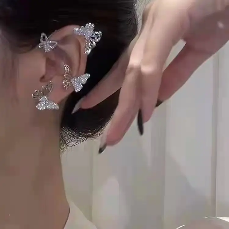 Luxury Shining Zircon Rhinestone Long Tassel Ear Cuff Earrings Exquisite Butterfly Leaf Clip Earrings Wedding Party Jewelry